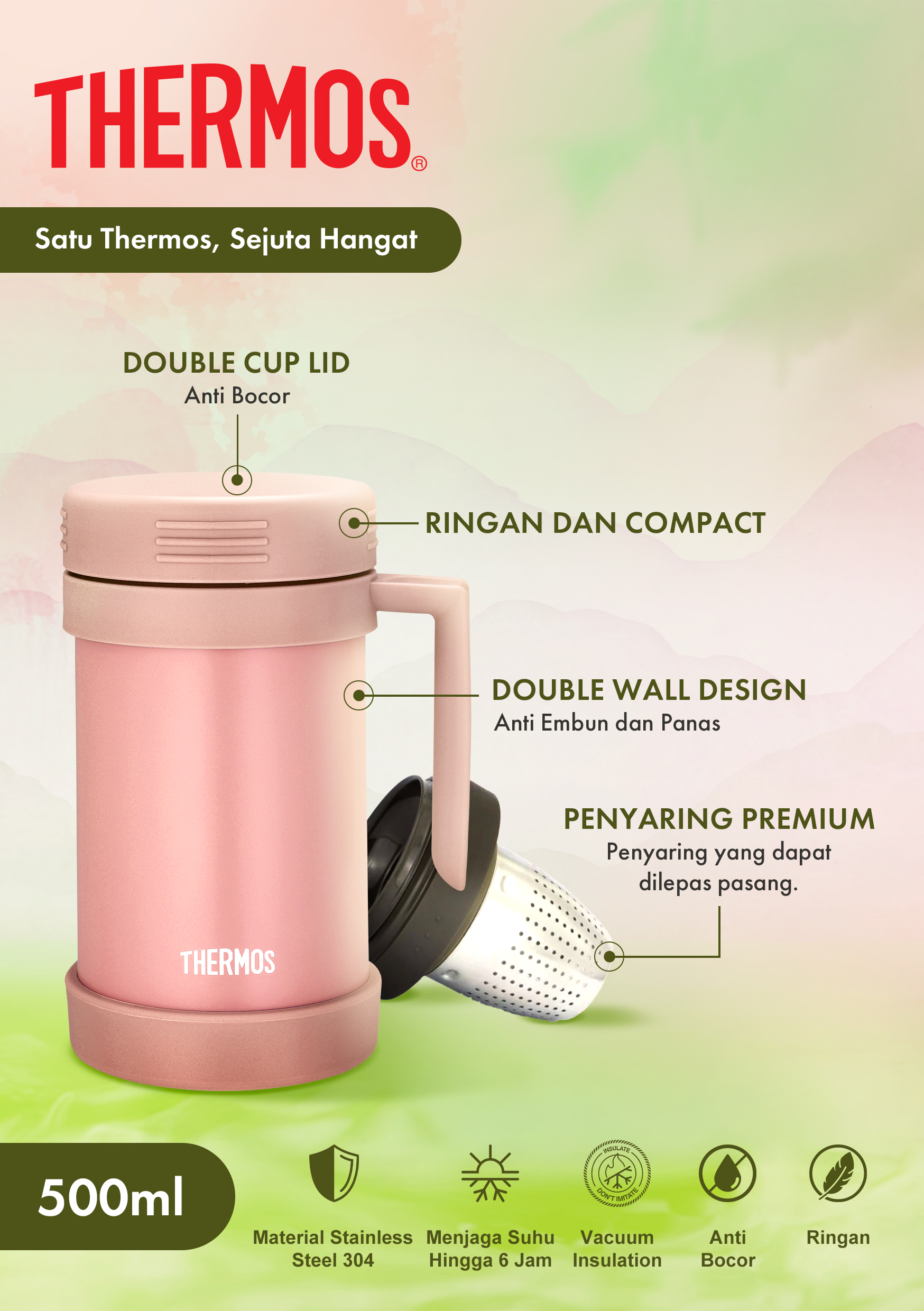 - Teknologi insulasi vakum Thermos untuk retensi suhu maksimal